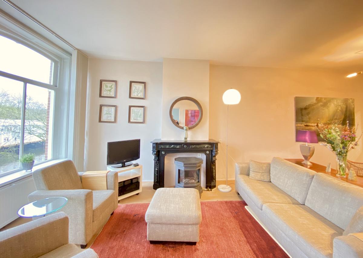 Canal view, balcony, bath, high ceilings, fireplace, half open kitchen.